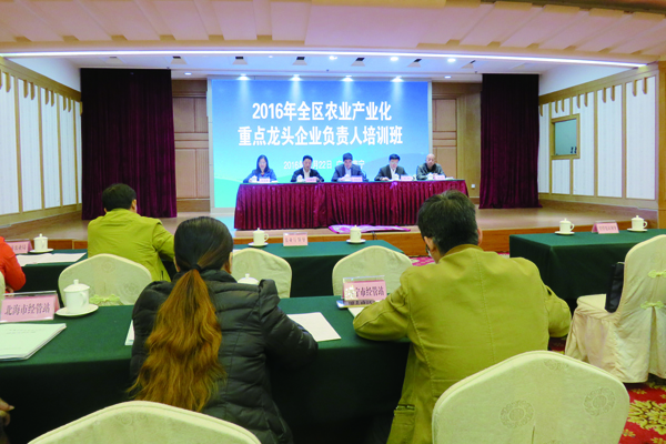 2016年度全區(qū)農(nóng)業(yè)產(chǎn)業(yè)化重點(diǎn)龍頭企業(yè)培訓(xùn)班于12月22日在南寧舉辦,正五海產(chǎn)與廣西中糧、常樂蠶絲、利添科技等8家北海本土企業(yè)與全區(qū)其他市農(nóng)業(yè)局(農(nóng)委)分管領(lǐng)導(dǎo)、農(nóng)業(yè)產(chǎn)業(yè)化辦公室負(fù)責(zé)人以及自治區(qū)農(nóng)業(yè)產(chǎn)業(yè)化重點(diǎn)龍頭企業(yè)代表共130多人參加培訓(xùn)。旨在認(rèn)真貫徹落實(shí)自治區(qū)黨委、政府的決策部署,交流學(xué)習(xí)龍頭企業(yè)在參與示范區(qū)創(chuàng)建、產(chǎn)業(yè)扶貧、企業(yè)創(chuàng)新管理以及文化建設(shè)等方面的主要經(jīng)驗(yàn)和做法,