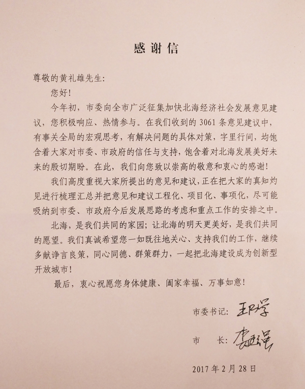 日前,正五集團收到北海市委、市政府來信,信中對黃禮雄董事長在“加快北海經(jīng)濟社會發(fā)展意見建議”的提案表示感謝。