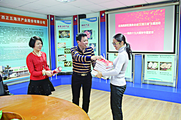 12月7日,北海高新區(qū)黨工委委員、管委會副主任傅文偉到正五海產(chǎn)公司海洋產(chǎn)業(yè)聯(lián)合黨支部開展服務企業(yè)“三有三送”主題活動——黨的十九大精神專題宣講,傳達了《中共北海市委員會關于認真學習貫徹自治區(qū)黨委彭清華書記在北海市學習宣傳貫徹黨的十九大精神座談會上的講話的通知》,向北海高新區(qū)海洋產(chǎn)業(yè)聯(lián)合黨支部贈送了書籍,為黨員們上了一堂生動的黨課。