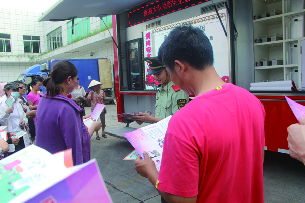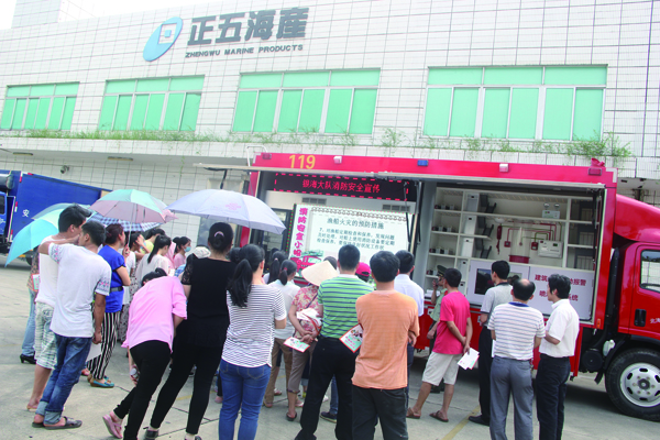 消防宣傳車一駛進公司,就吸引了眾多員工的目光, 大家紛紛圍了上來?!霸谌粘I钪幸⒁獠荒芩嚼瓉y接電線,天冷使用電熱器、火爐取暖時要及時清理周邊的可燃易燃物?!毕廊藛T耐心地為群眾講解了家庭用火、用電安全注意事項、逃生自救口訣、家庭火災案例分析及漁船火災的預防措施等安全知識,簡單講解了火災存在的危險性、火災的燃燒特性和火災發(fā)生時的逃生自救方法。