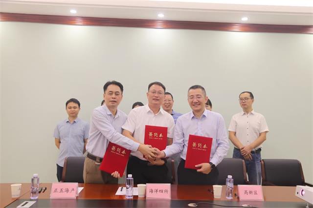 海洋四所紀(jì)委書記周雄,高新區(qū)黨工委書記、管委會主任梁小雄,正五海產(chǎn)公司副總經(jīng)理上官云山出席儀式并簽署合作協(xié)議。